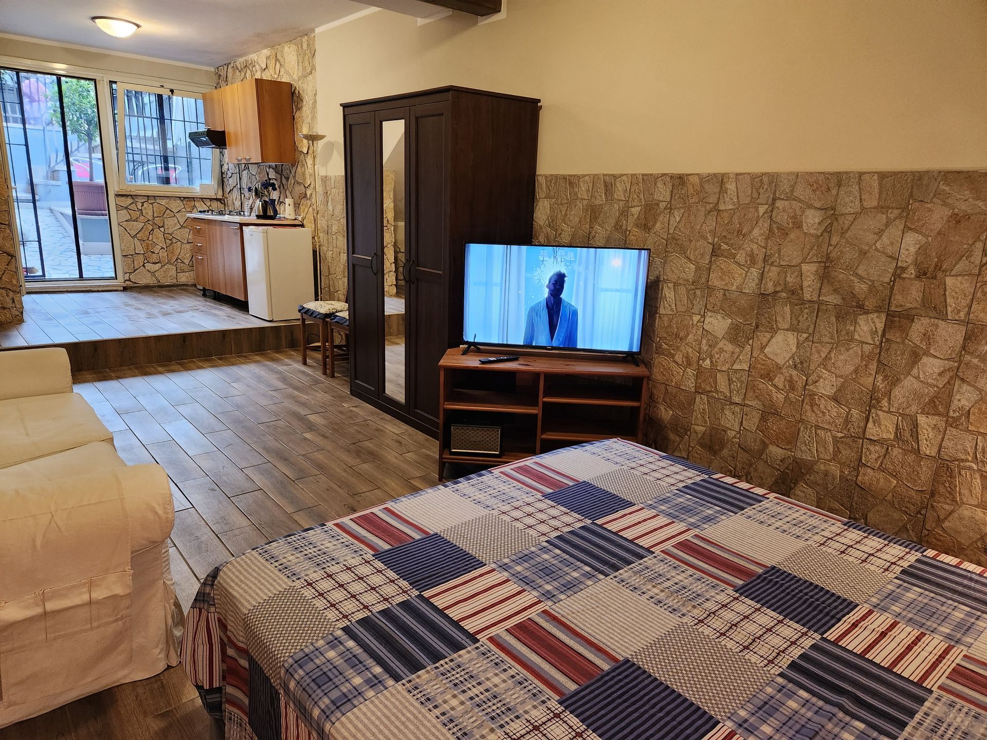 The studio apartment consists of a single room with kitchenette and a bathroom with shower.