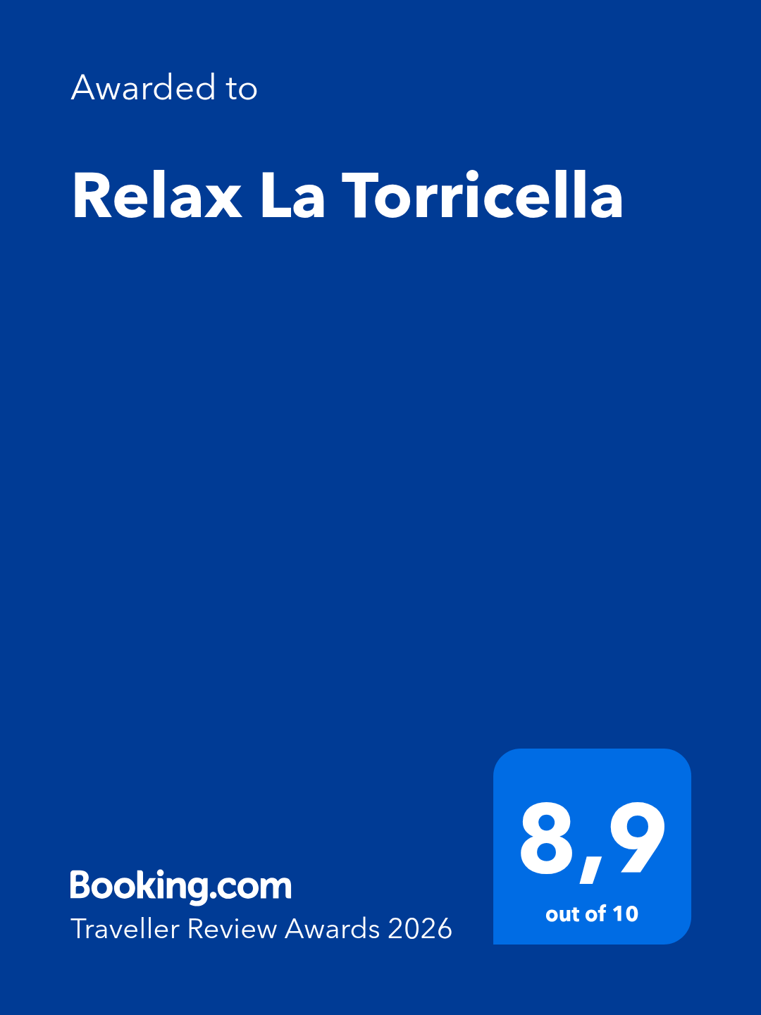 - It is also possible to book through the website "www.booking.com" by searching for the property "Relax La Torricella". For the reservation, payment of 100% of the total fee is required at the time of booking.